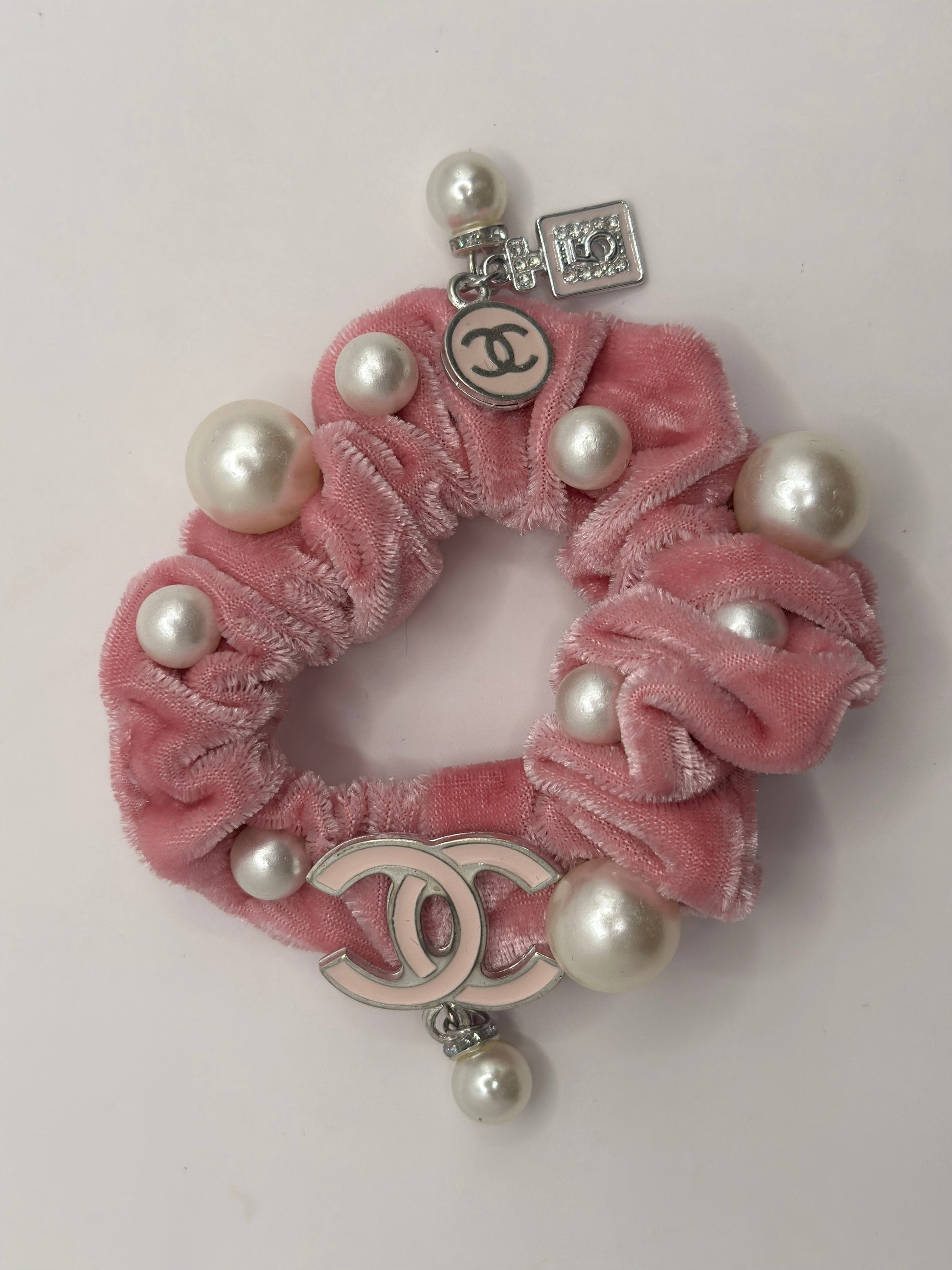 Elastico per capelli in tessuto rosa e decorazioni di perle loghi in plexiglas con ciondoli in metallo.