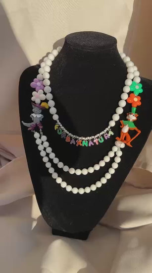 Perle in pietre naturale bianco latte distanziatori in ematite personaggi e fiori in polimero cm 50+ catenella e l’altra 45cm con catenella