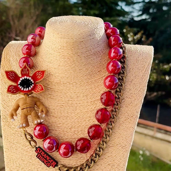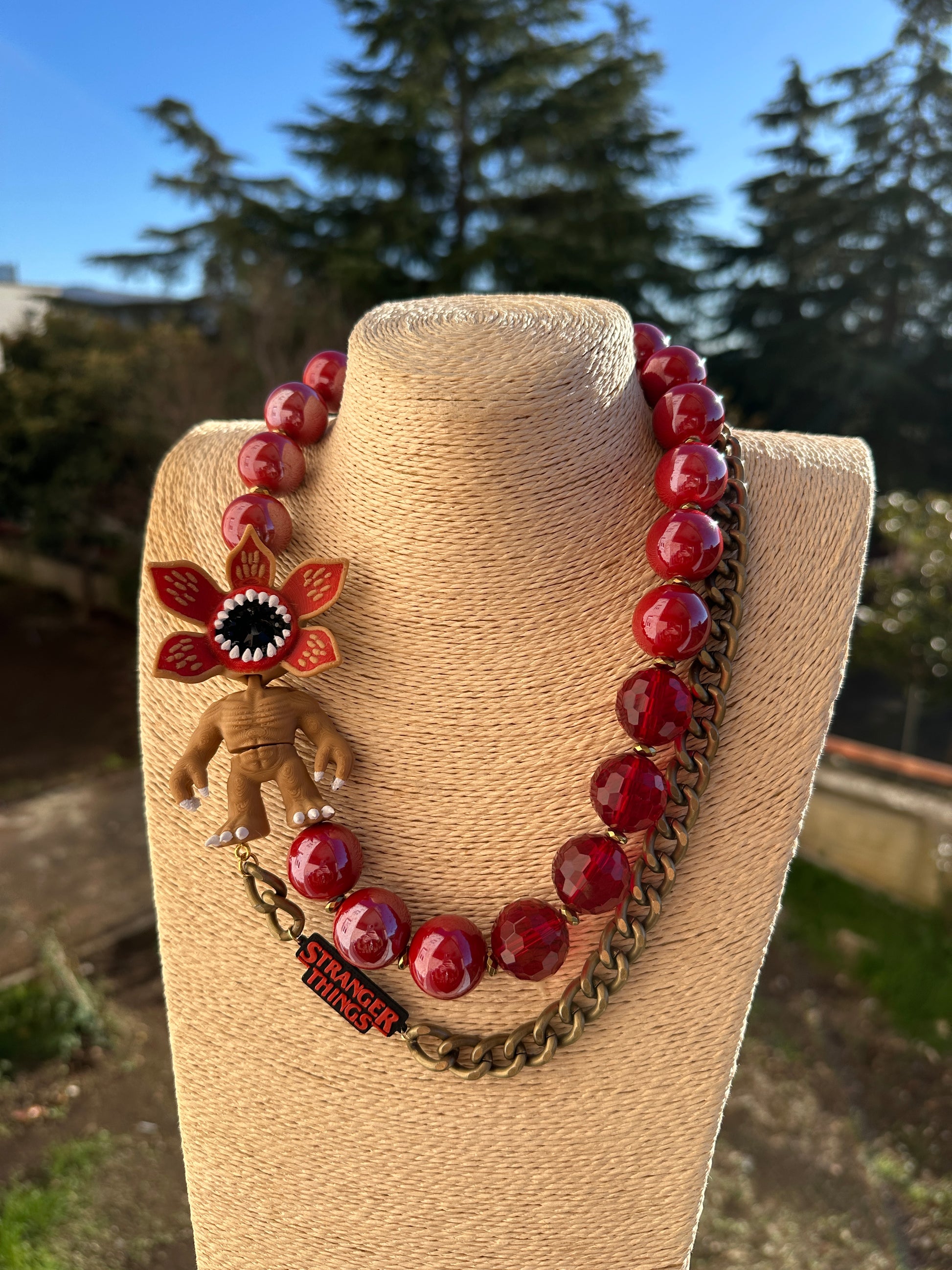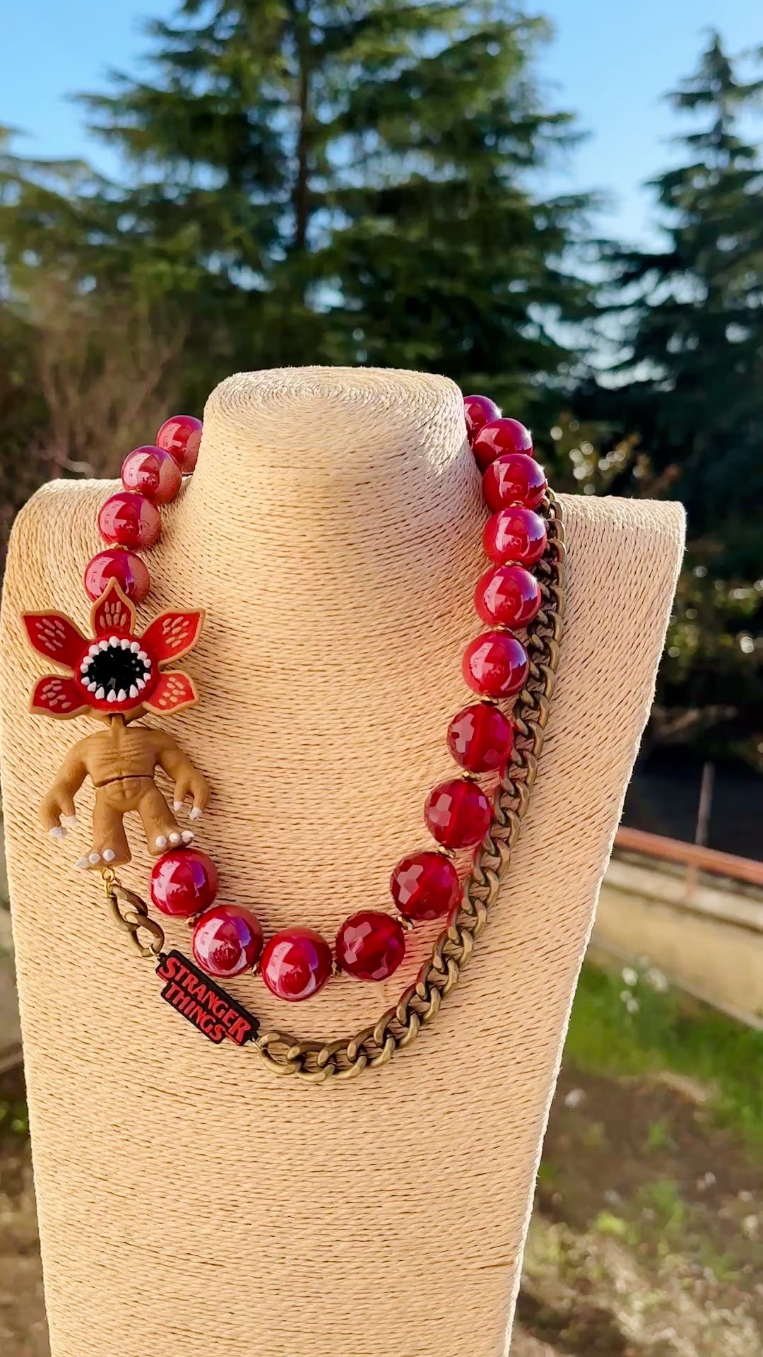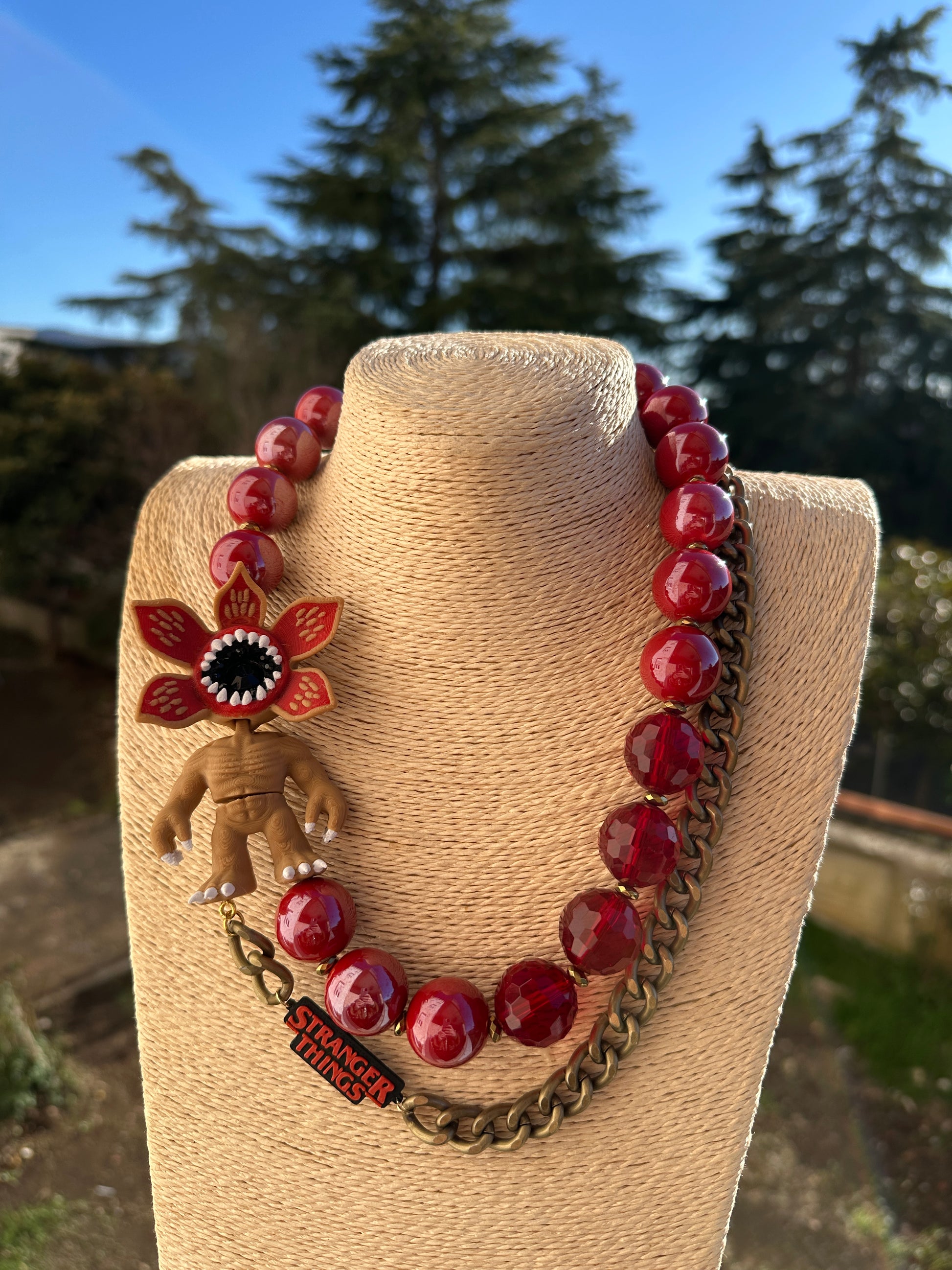 Collana tema demogorgone con Boule in ceramica e vetro con catena acciaio personaggio in polimero lunghezza 50 cm con catenella regolatrice