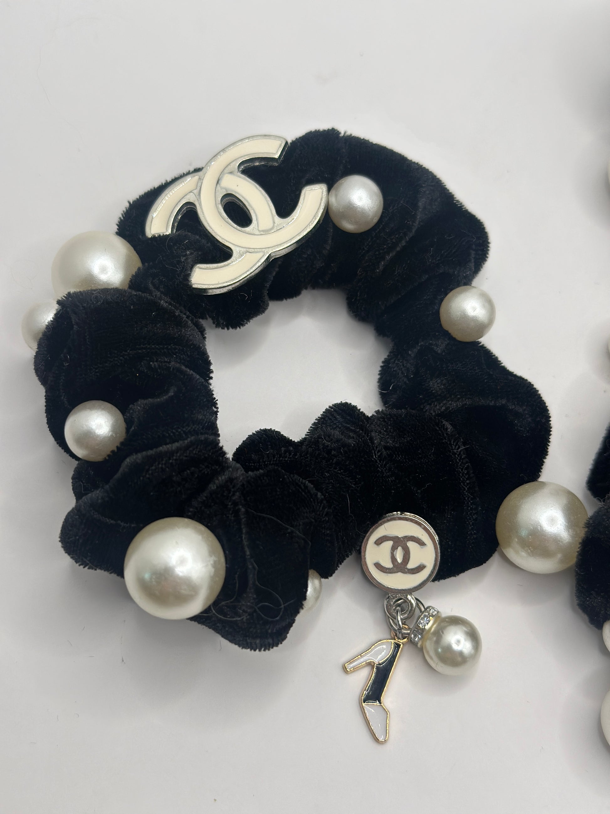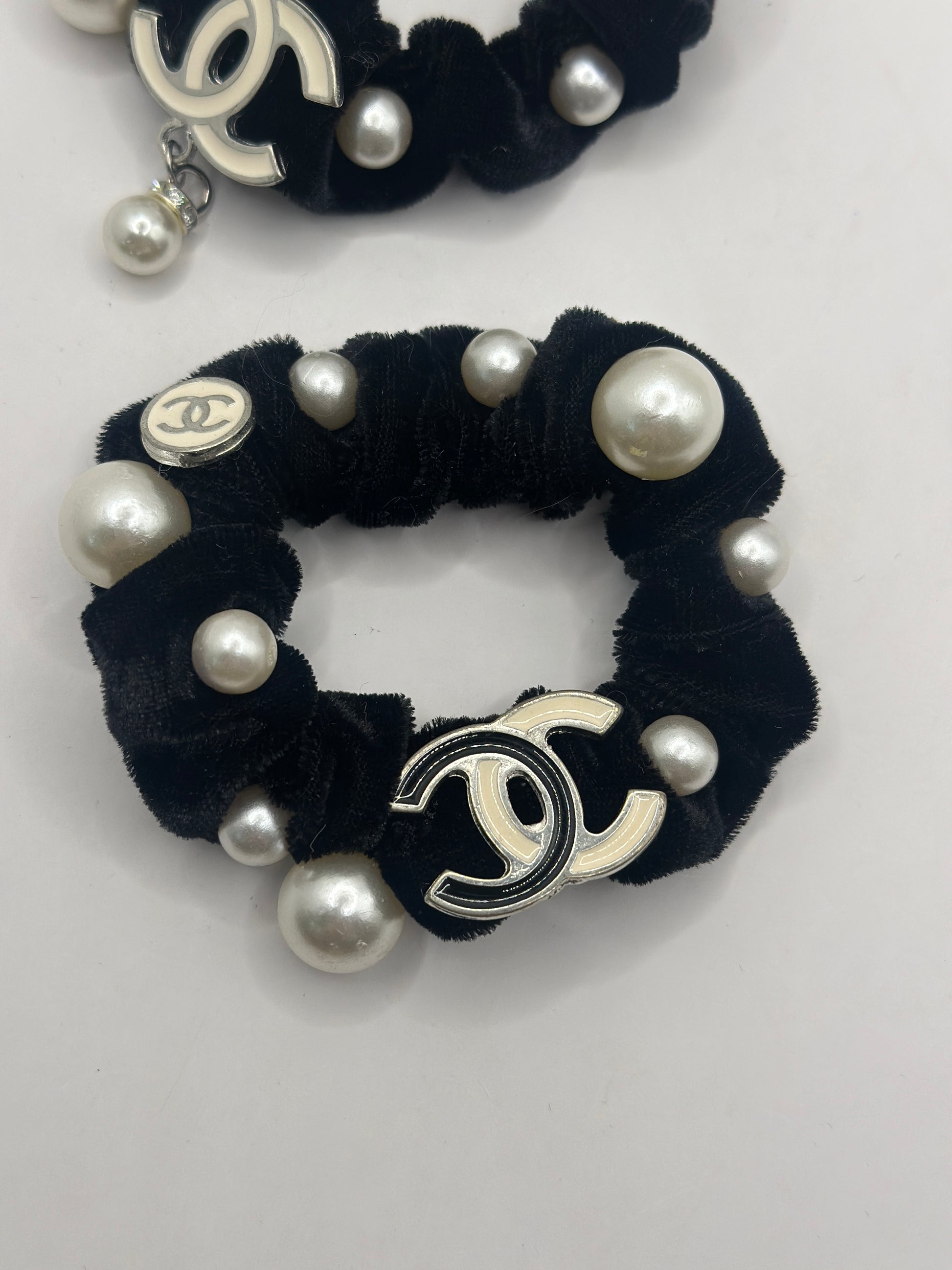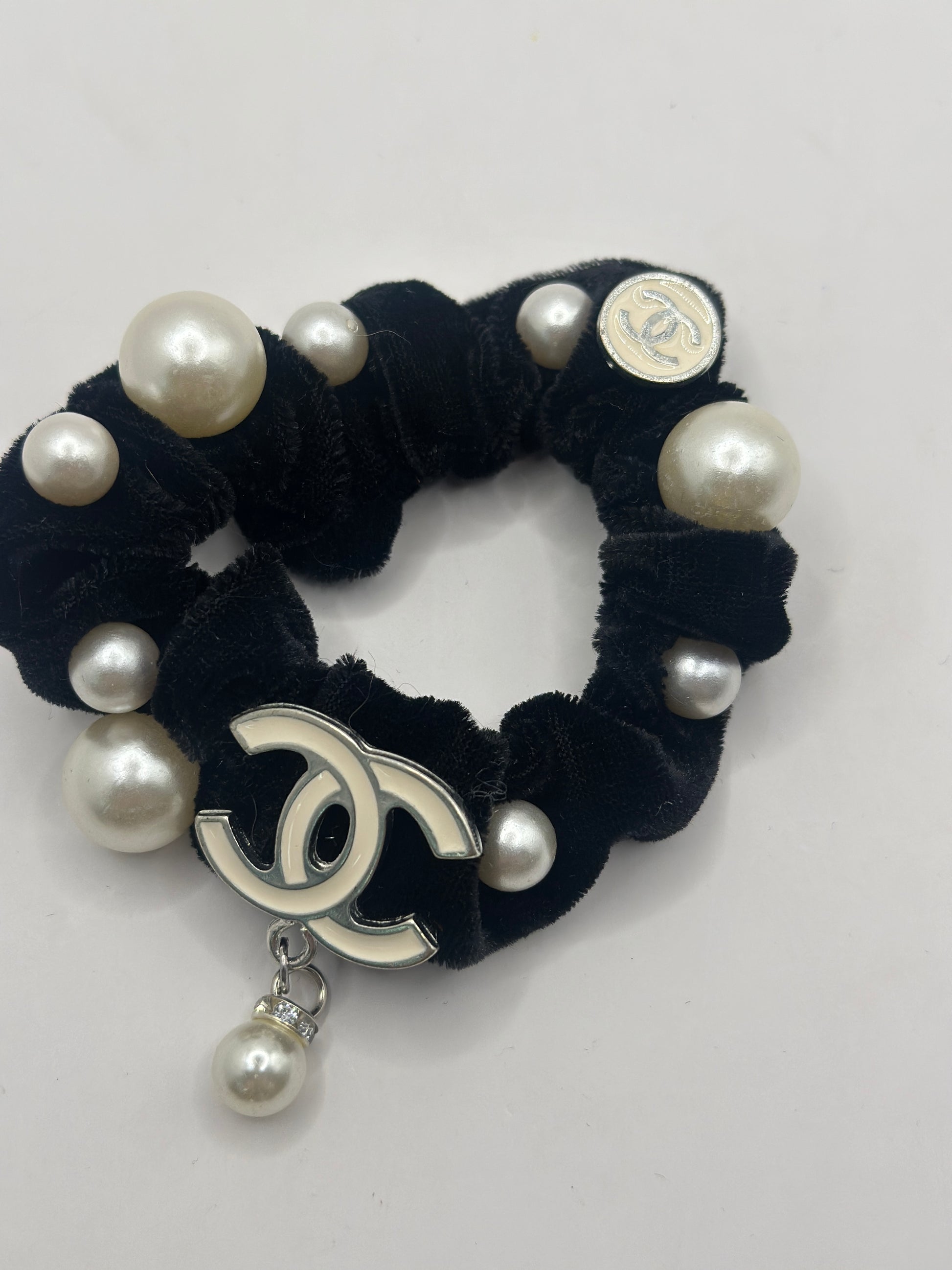 Elastico per capelli in tessuto nero e decorazioni di perle loghi in plexiglas con ciondoli in metallo.