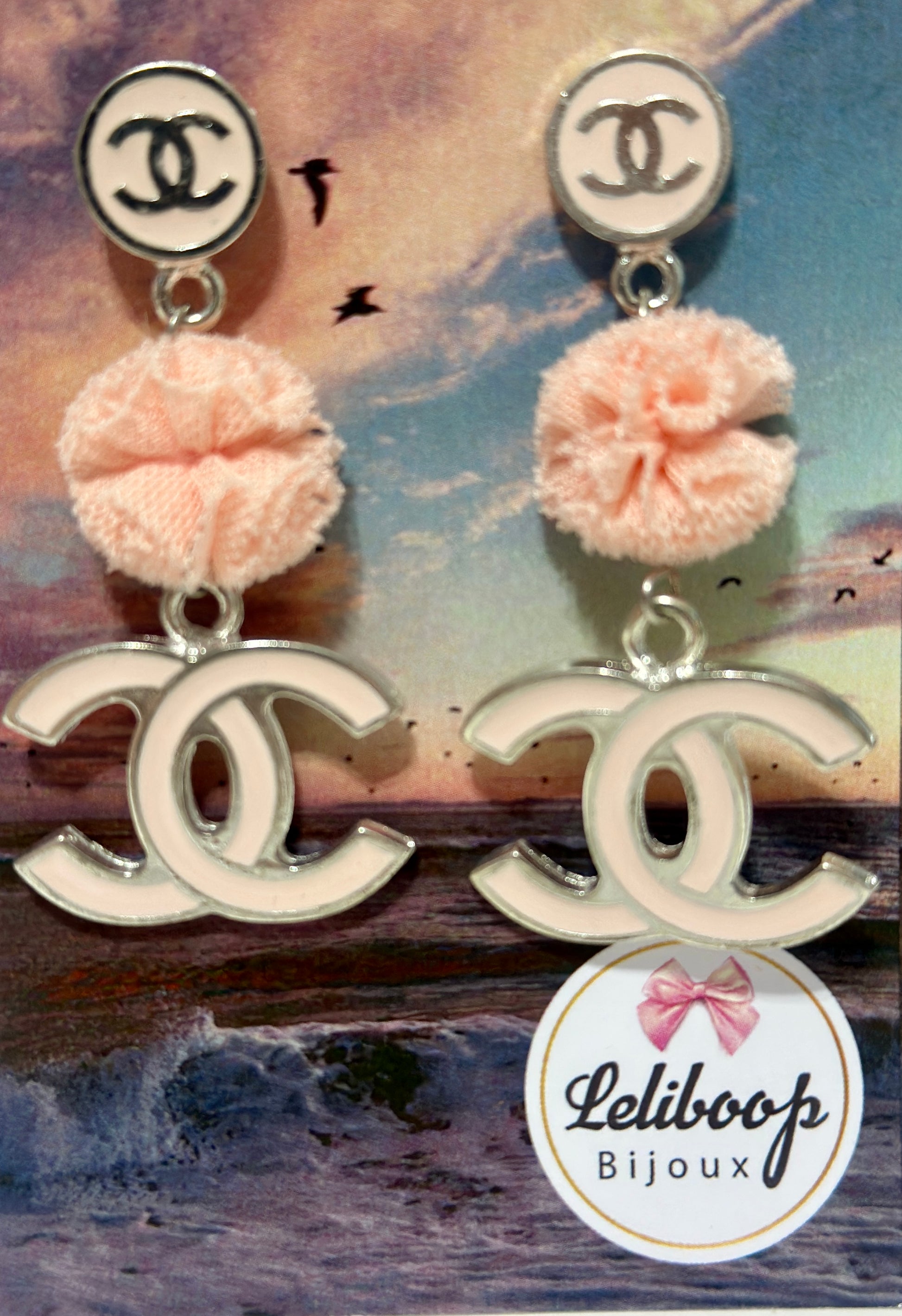 Orecchino lunghezza 6 cm circa con bottone e ciondolo in metallo lavorato e pom pom in pizzo